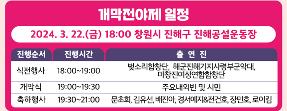 개막전야제는 3월22일 금요일 오후6시에 열립니다.
